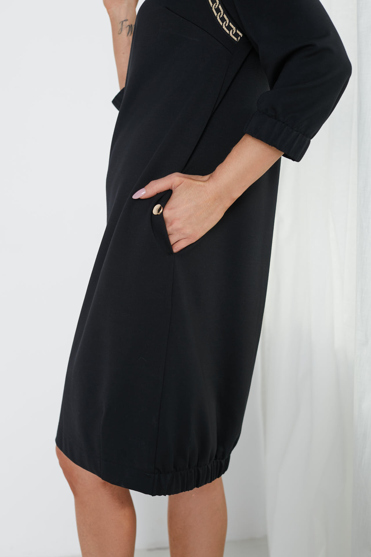 Ta klasyczna czarna sukienka to absolutny "must have" w twojej garderobie. Zgodnie z polityką firmy stawiamy na wszechstronność produktu. Dlatego właśnie długość w kolanko i swobodny krój który daje komfort kobietom w każdym rozmiarze. Całość oczywiście uszyta z naszej miękkiej i elastycznej dzianiny typu "MORGAN", która sprawdza się zarówno jako dzianina na wyjścia wizytowe jak i na co dzień do pracy. Staranne przeszycia oraz ozdobne taśmy z lurexem nadają oryginalnego charakteru tej sukience.