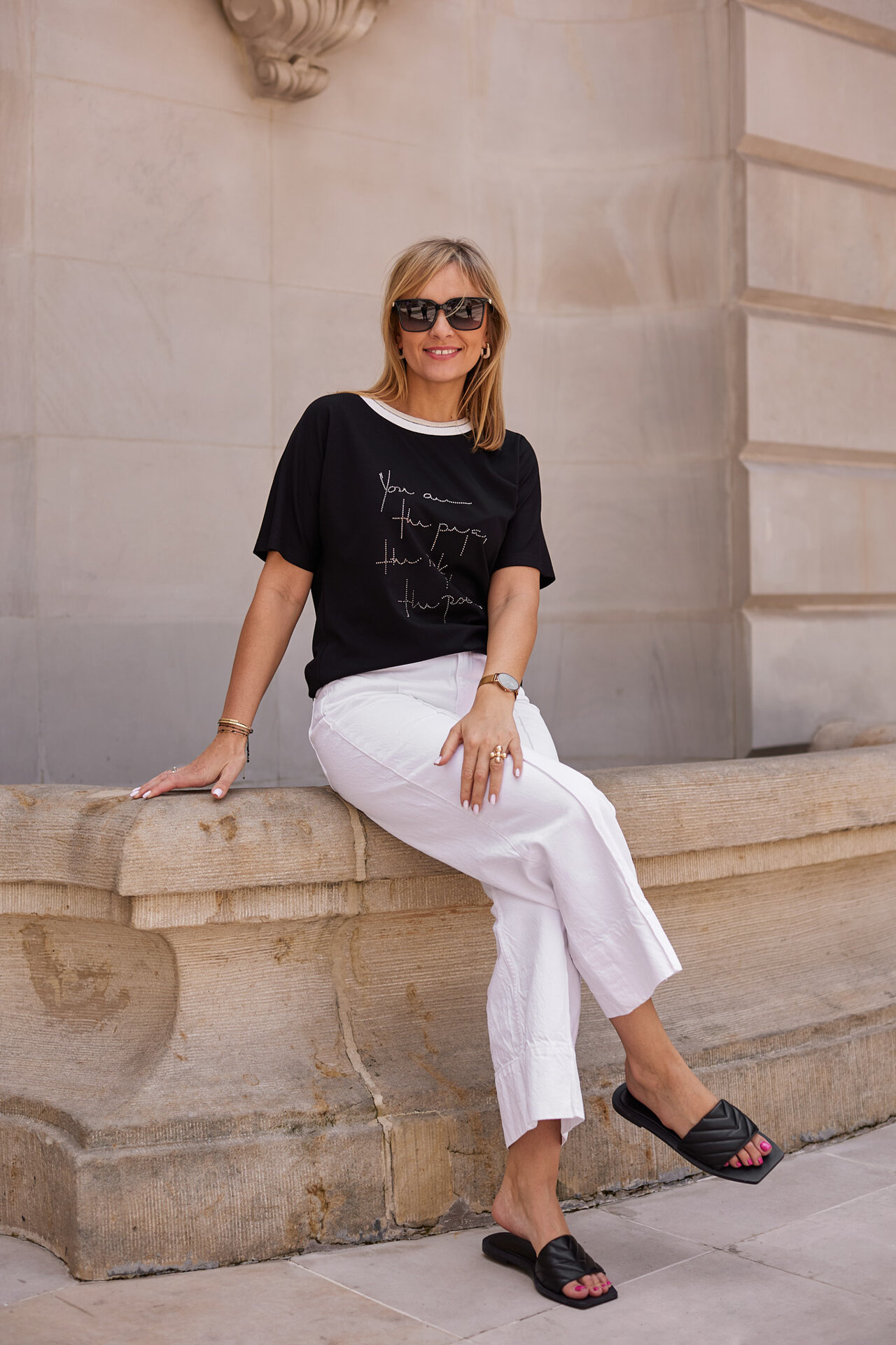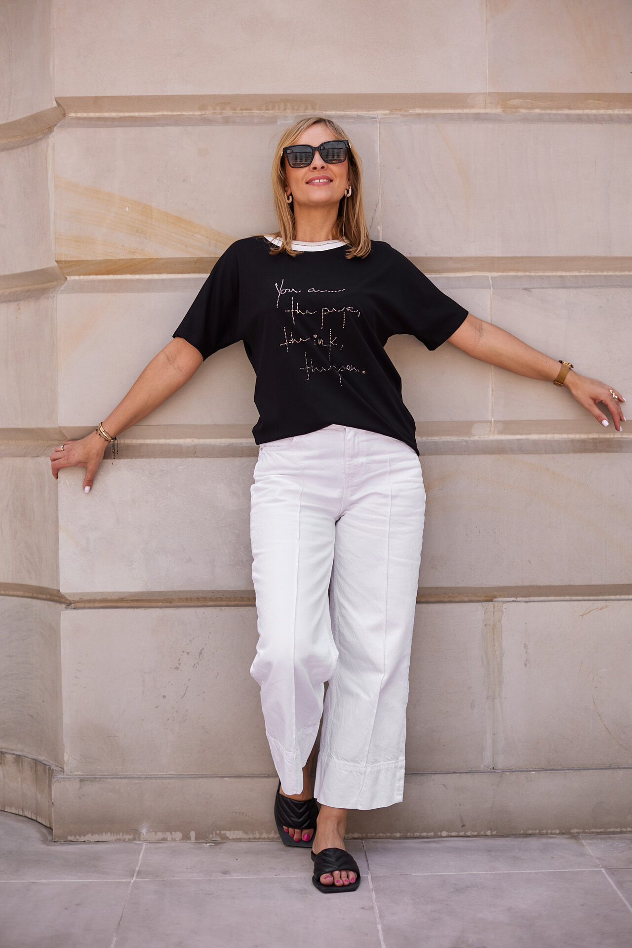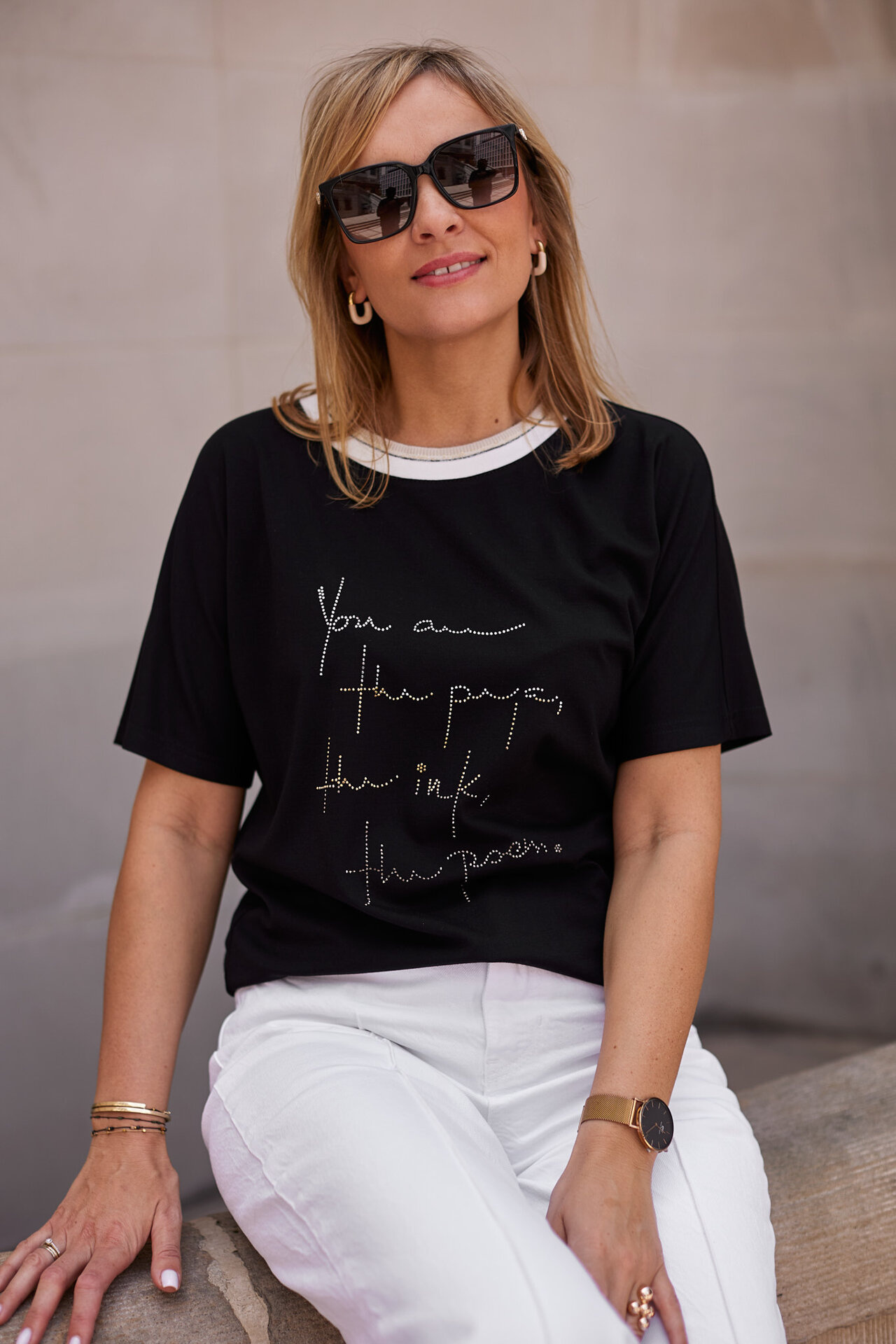 Sportily elegant blouse with rhinestones and a decorative cuff