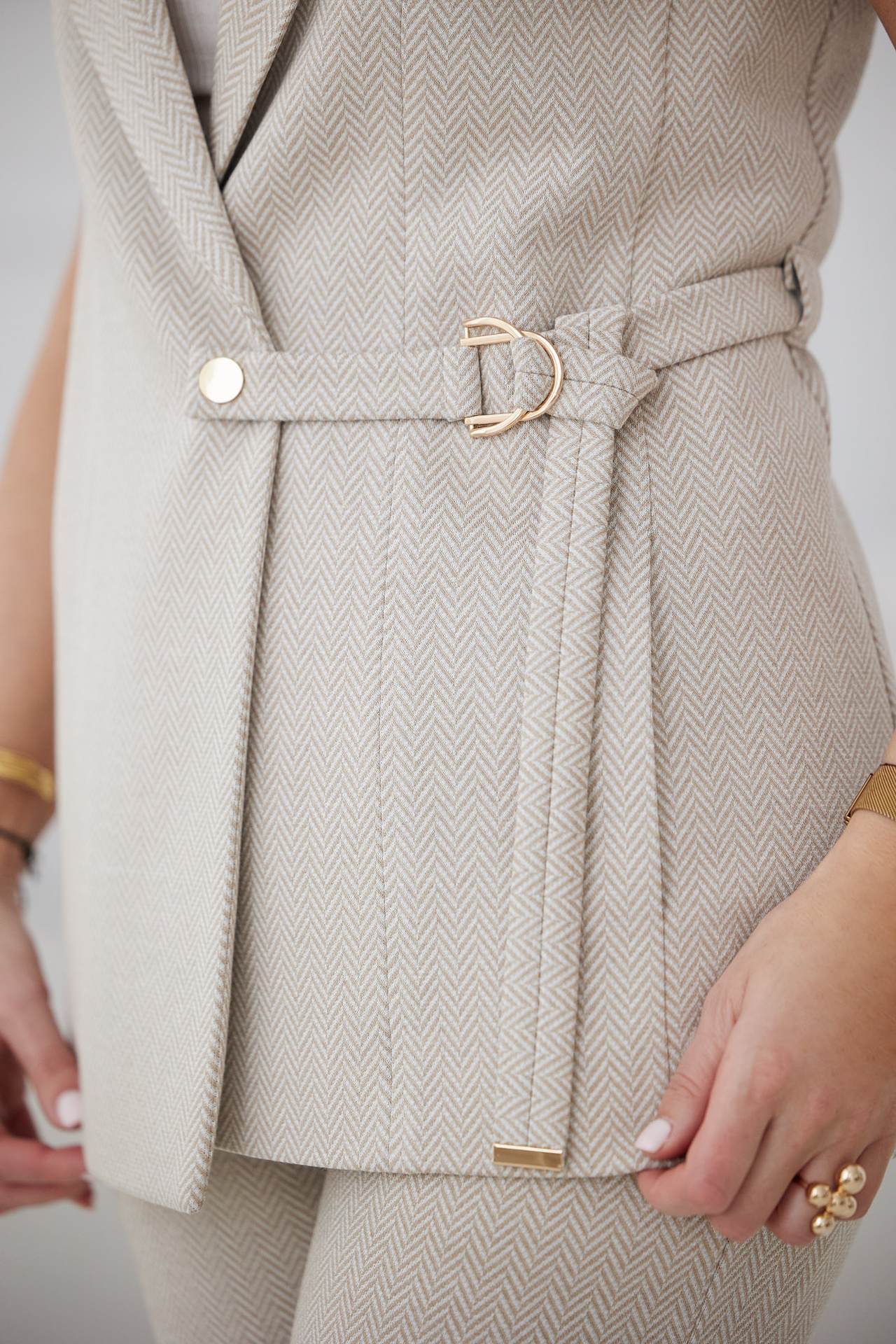 Wyjątkowa i designerska kamizelka żakietowa to świetne dopełnienie twojej garderoby. Staranne szycie oraz metalowe okucia dodają jej charakteru. Kamizelka wykonana z podklejanej dzianiny żakardowej przez co świetnie się układa. Zaprojektowana zgodnie z zasadami marki LA'AURORA czyli z myślą o kobietach dojrzałych. Dzięki swojemu wyjątkowemu fasonowi doskonale sprawdza się u Pań w większych rozmiarach. Doskonała jakość wykonania i wykończenia.