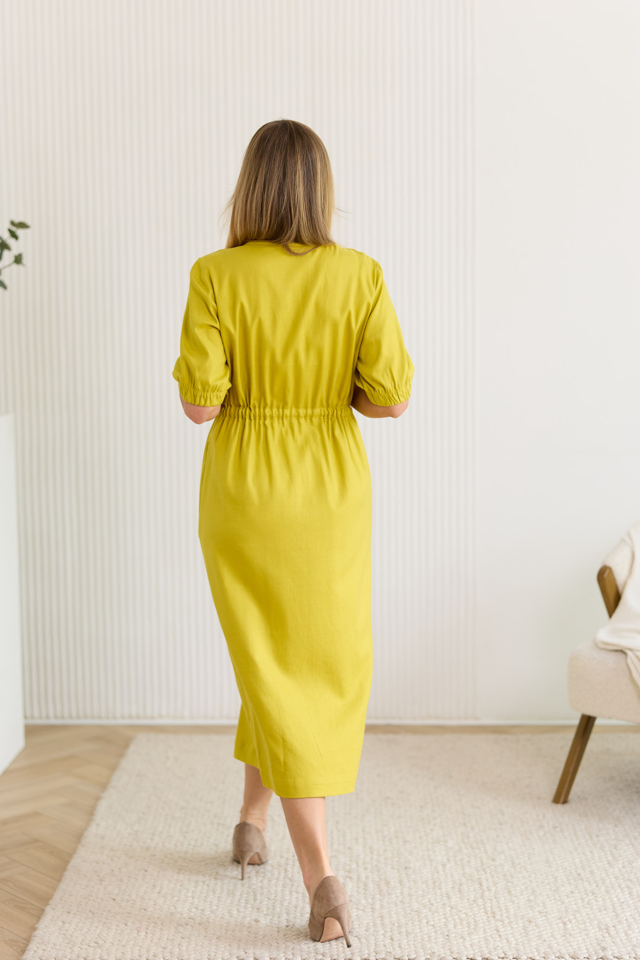 Lniana sukienka za kolana z regulacją w talii, powlekane guziki